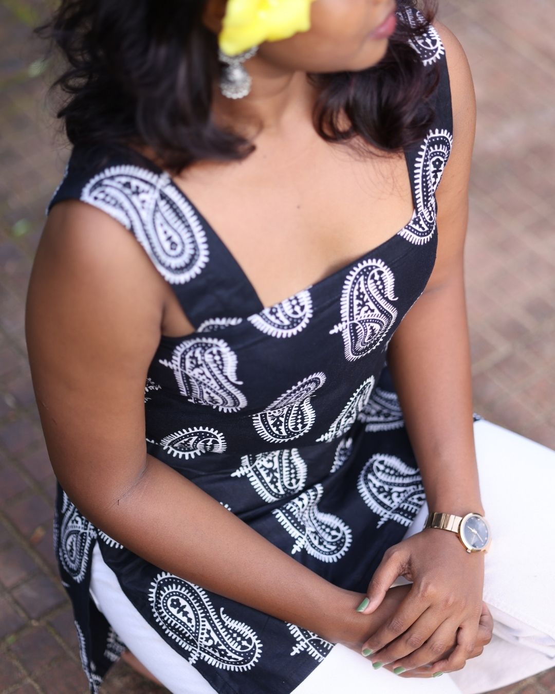 Black sleeveless kurti with white paisley print, square neckline, and comfortable fit - perfect for casual and everyday wear.